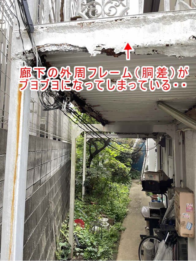 廊下を支える外周の鉄骨フレームは、内部まで腐食が進行し、もはや鉄としての強度を失っていました。このような状態では、溶接をしても母材がもたず、塗装をしてもすぐに剥がれてしまい、保護効果が見込めません。